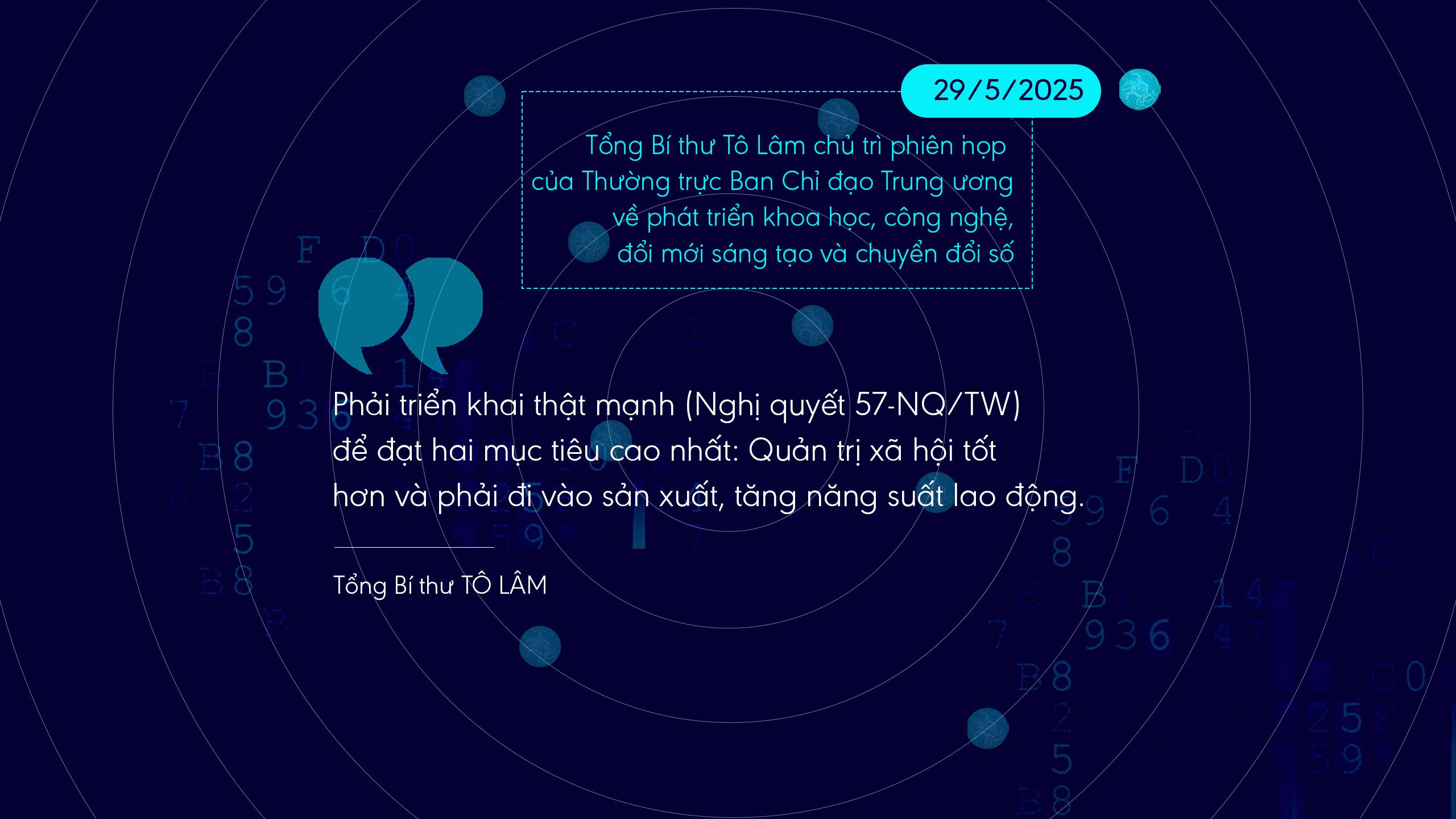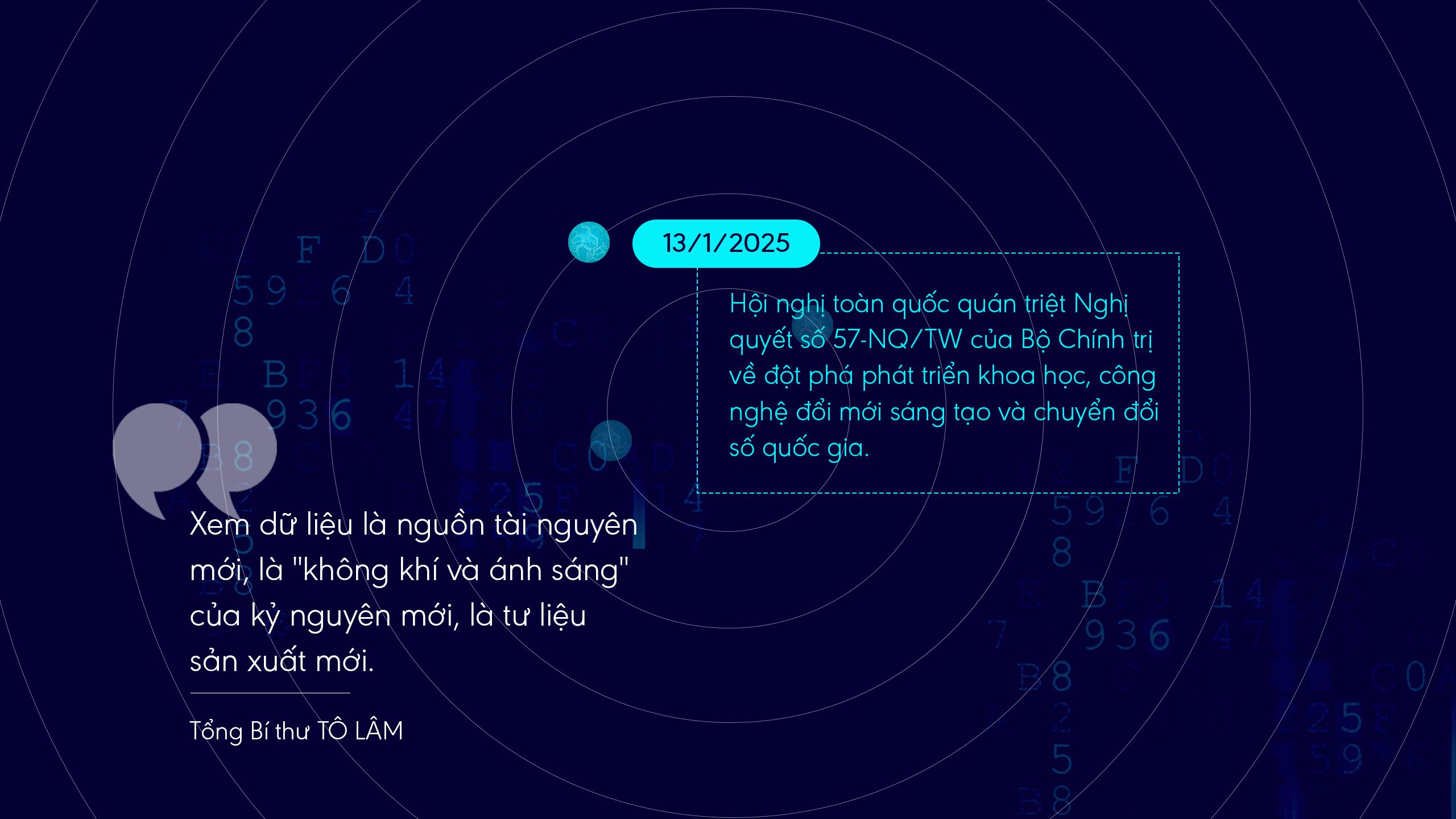 Cụ thể, chỉ 3 tuần sau khi Nghị quyết 57/NQ-TW ra đời, ngày 13/1, tại Hội nghị toàn quốc quán triệt Nghị quyết số 57-NQ/TW của Bộ Chính trị về đột phá phát triển khoa học, công nghệ đổi mới sáng tạo và chuyển đổi số quốc gia, Tổng Bí thư Tô Lâm nhấn mạnh, Đảng và Nhà nước luôn coi khoa học, công nghệ là yếu tố quyết định và nền tảng cho sự phát triển bền vững của đất nước. Một lần nữa, đồng chí nhấn mạnh: “Xem dữ liệu là nguồn tài nguyên mới, là "không khí và ánh sáng" của kỷ nguyên mới, là tư liệu sản xuất mới”.