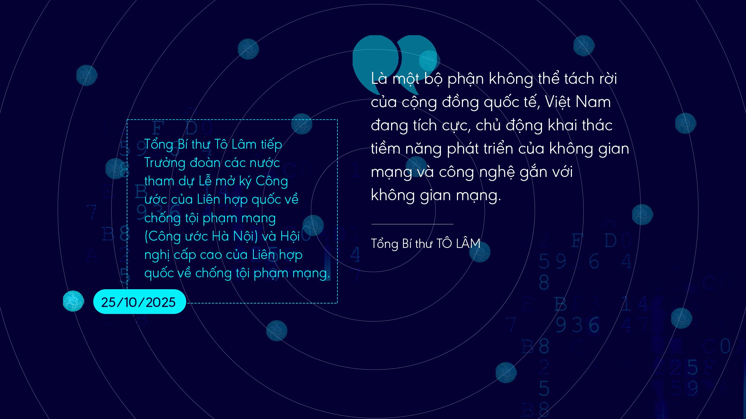 Và mới đây, vào chiều 25/10, tại Trụ sở Trung ương Đảng, Tổng Bí thư Tô Lâm đã tiếp Trưởng đoàn các nước tham dự Lễ mở ký Công ước của Liên hợp quốc về chống tội phạm mạng (Công ước Hà Nội) và Hội nghị cấp cao của Liên hợp quốc về chống tội phạm mạng.