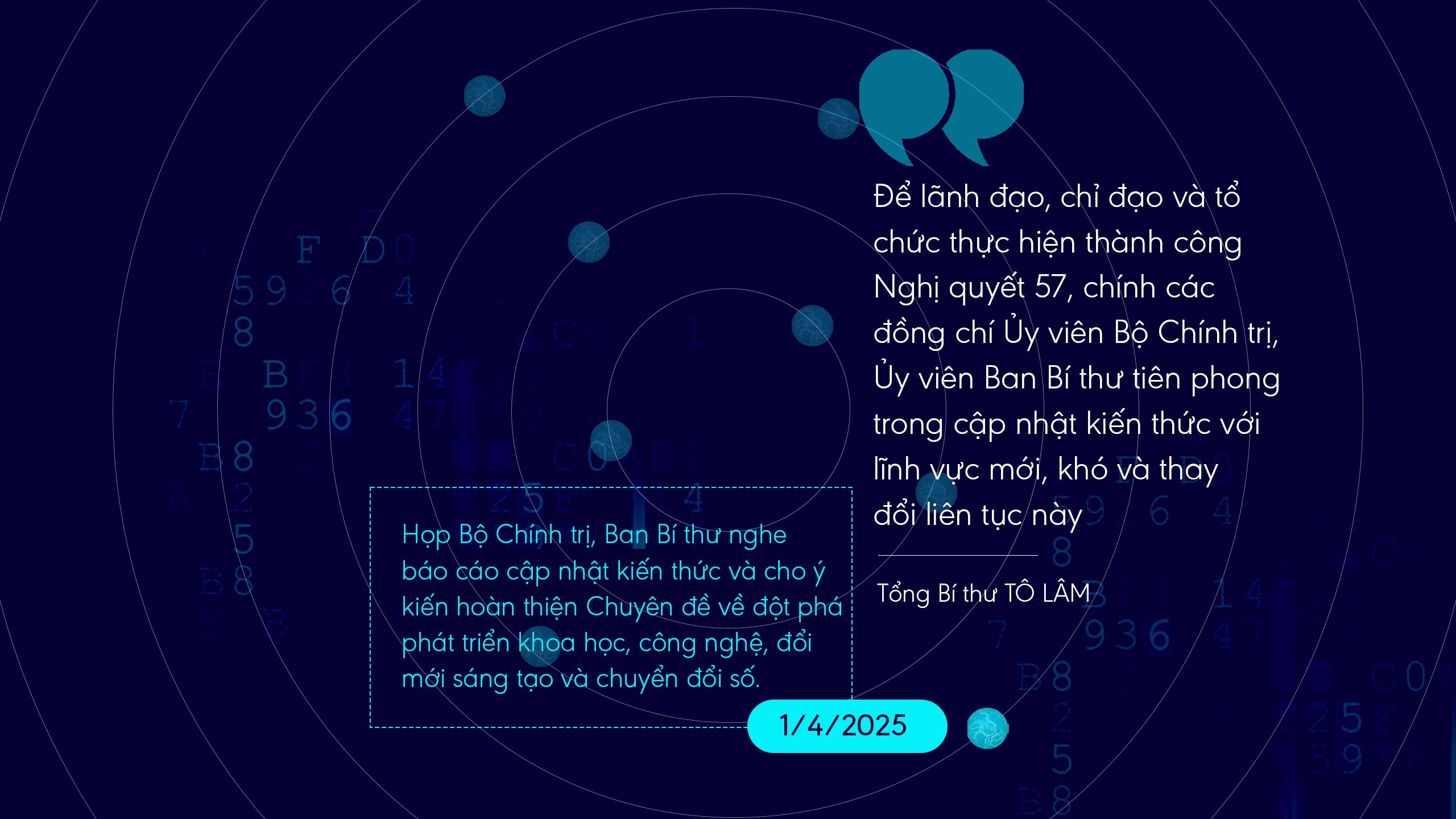 Đến ngày 1/4, Tổng Bí thư Tô Lâm tiếp tục chủ trì cuộc họp Bộ Chính trị, Ban Bí thư nghe báo cáo cập nhật kiến thức và cho ý kiến hoàn thiện Chuyên đề về đột phá phát triển khoa học, công nghệ, đổi mới sáng tạo và chuyển đổi số. Tại cuộc họp này, đồng chí Tổng Bí thư Tô Lâm chỉ đạo, để lãnh đạo, chỉ đạo và tổ chức thực hiện thành công Nghị quyết 57, chính các đồng chí Ủy viên Bộ Chính trị, Ủy viên Ban Bí thư tiên phong trong cập nhật kiến thức với lĩnh vực mới, khó và thay đổi liên tục này.