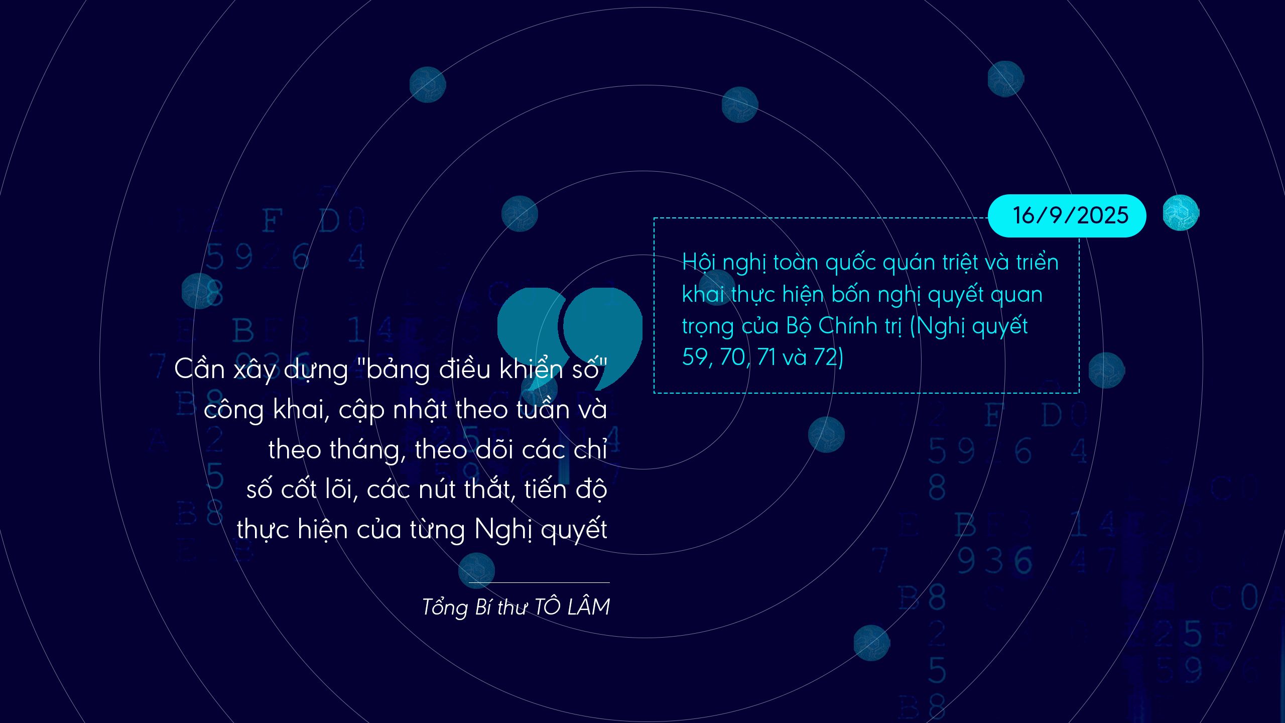 Ngày 16/9, tại Hội nghị toàn quốc quán triệt và triển khai thực hiện bốn nghị quyết quan trọng của Bộ Chính trị (Nghị quyết 59, 70, 71 và 72), lần đầu tiên bài phát biểu của đồng chí Tô Lâm, lãnh đạo cao nhất của Đảng đề cập đến khái niệm “bảng điều khiển số” như một công cụ quản trị hiện đại.