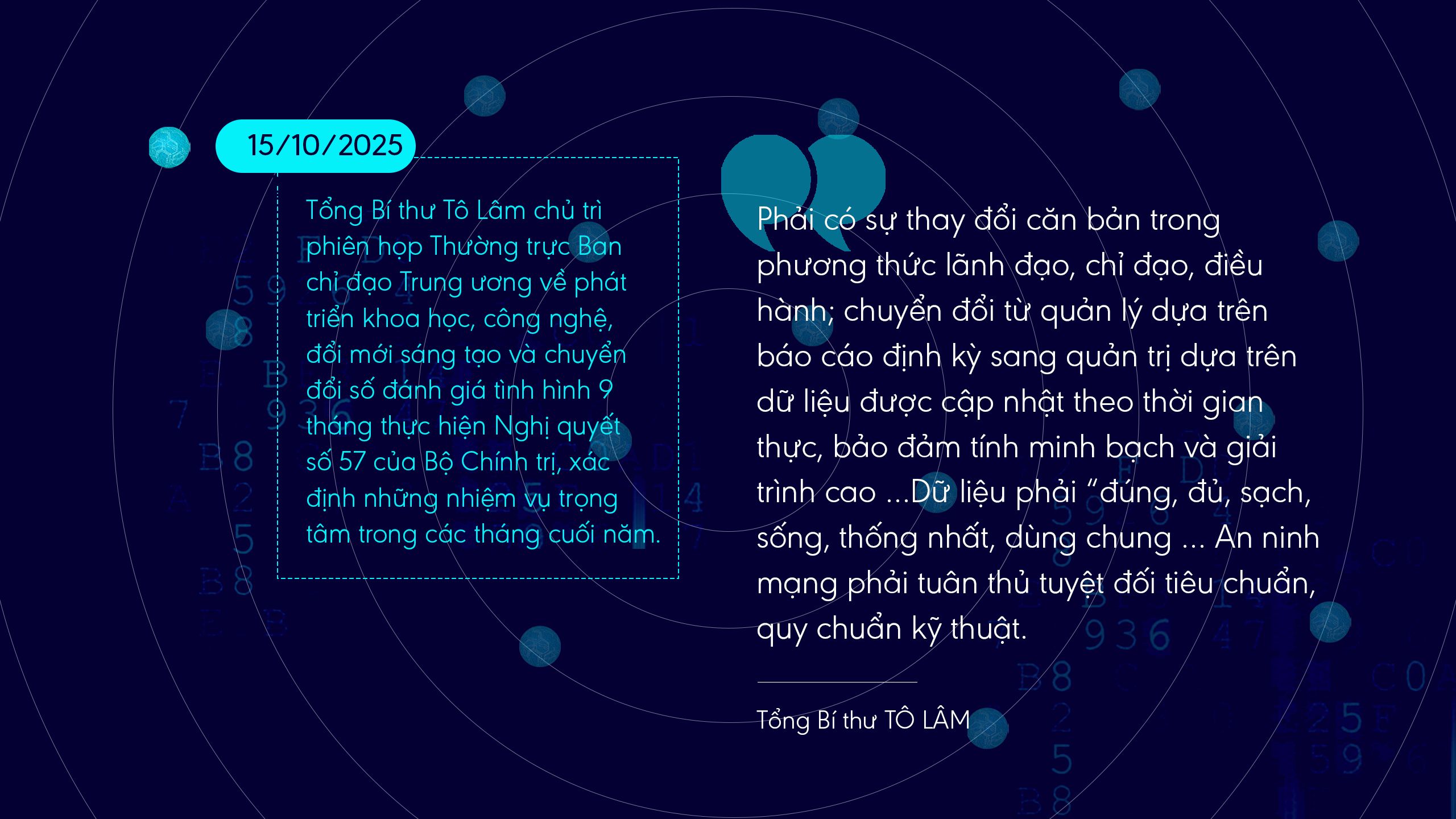 Ngày 15/10, tại phiên họp Thường trực Ban chỉ đạo Trung ương về phát triển khoa học, công nghệ, đổi mới sáng tạo và chuyển đổi số đánh giá tình hình 9 tháng thực hiện Nghị quyết số 57 của Bộ Chính trị, xác định những nhiệm vụ trọng tâm trong các tháng cuối năm, Tổng Bí thư Tô Lâm một lần nữa nhắc đến việc quản trị dựa trên dữ liệu. Cụ thể, đồng chí Tổng Bí thư yêu cầu phải có sự thay đổi căn bản trong phương thức lãnh đạo, chỉ đạo, điều hành; chuyển đổi từ quản lý dựa trên báo cáo định kỳ sang quản trị dựa trên dữ liệu được cập nhật theo thời gian thực, bảo đảm tính minh bạch và giải trình cao.