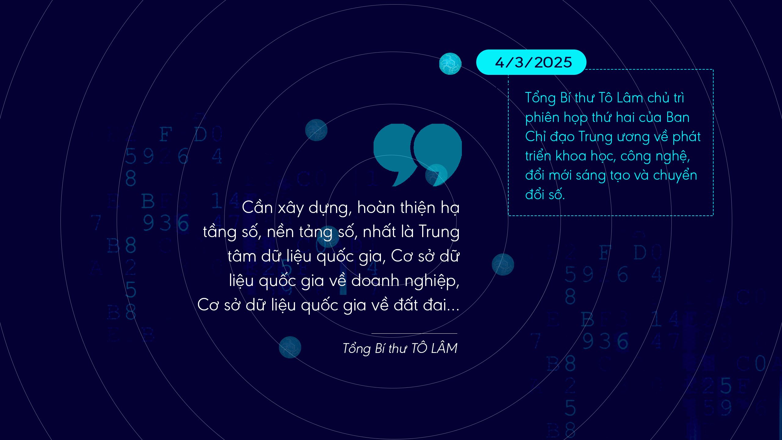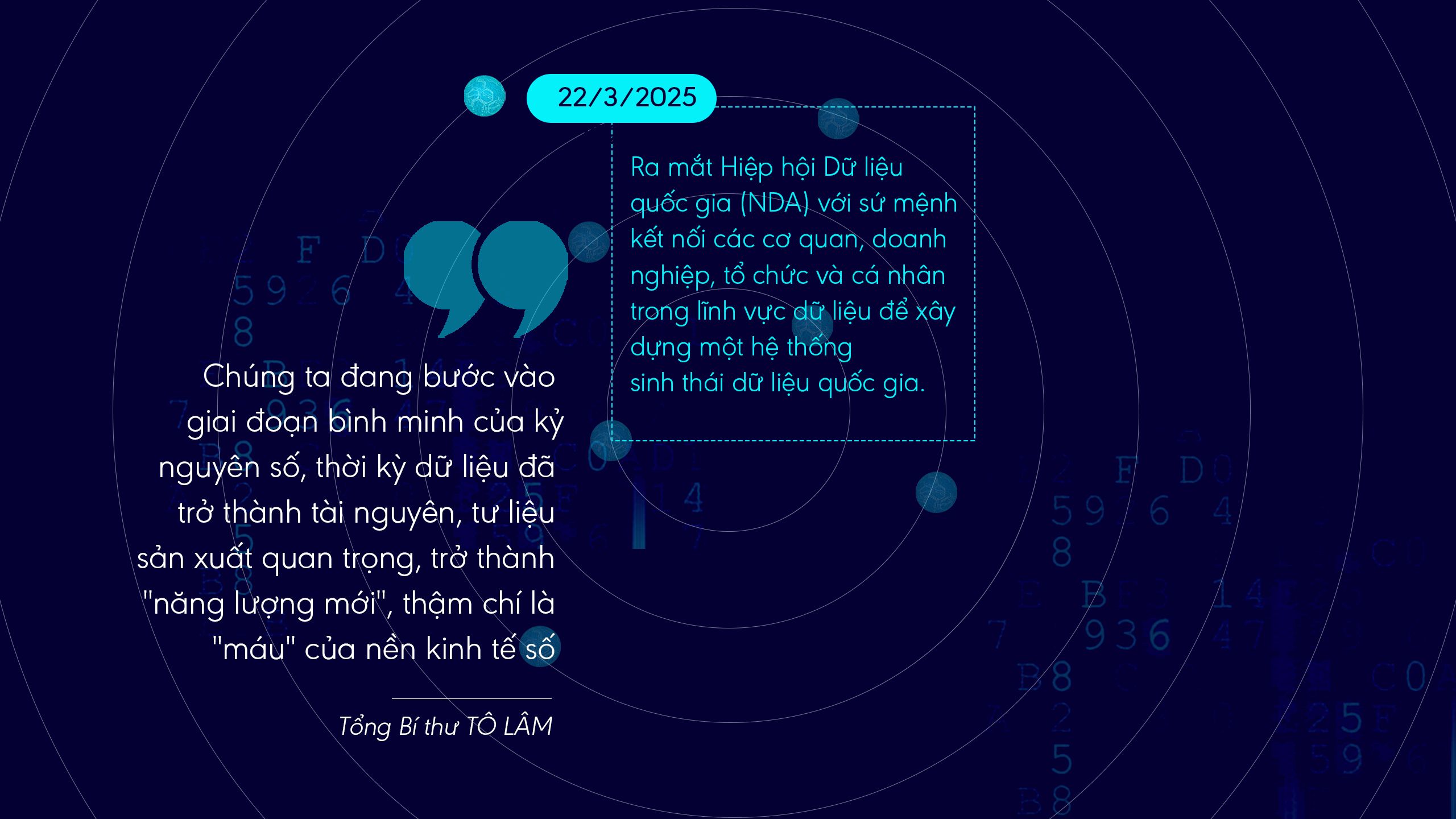 Tiếp tục, để thực hiện những chủ trương của Đảng về phát triển dữ liệu, chỉ hơn hai tháng sau, sáng 22/3, Hiệp hội Dữ liệu quốc gia (NDA) chính thức ra mắt với sứ mệnh kết nối các cơ quan, doanh nghiệp, tổ chức và cá nhân trong lĩnh vực dữ liệu để xây dựng một hệ thống sinh thái dữ liệu quốc gia. Phát biểu chỉ đạo tại Đại hội, Tổng Bí thư Tô Lâm nhấn mạnh: "Chúng ta đang bước vào giai đoạn bình minh của kỷ nguyên số, thời kỳ dữ liệu đã trở thành tài nguyên, tư liệu sản xuất quan trọng, trở thành "năng lượng mới", thậm chí là "máu" của nền kinh tế số. Chuyển đổi số, với dữ liệu là trung tâm, đang làm thay đổi căn bản cách chúng ta sống, làm việc và phát triển".
