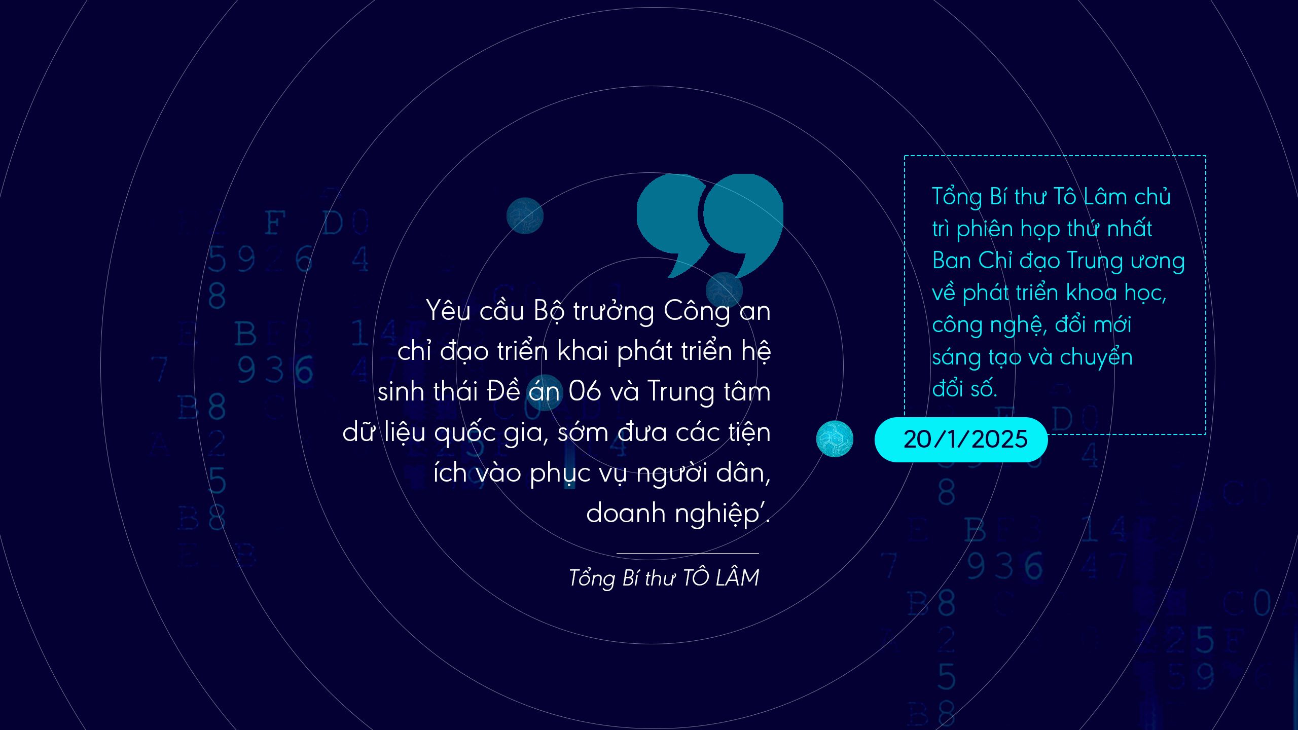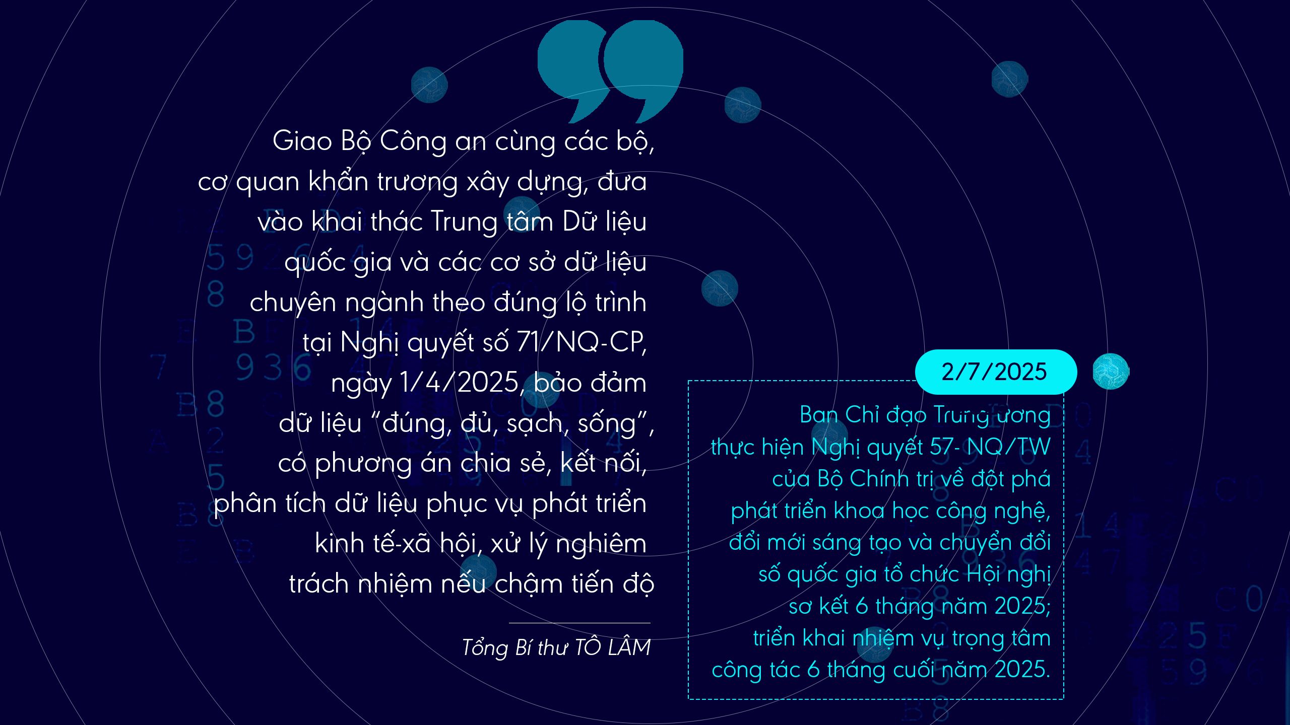 Đồng chí Tô Lâm, Tổng Bí thư, Trưởng Ban Chỉ đạo Trung ương đã giao Bộ Công an cùng các bộ, cơ quan khẩn trương xây dựng, đưa vào khai thác Trung tâm Dữ liệu quốc gia và các cơ sở dữ liệu chuyên ngành theo đúng lộ trình tại Nghị quyết số 71/NQ-CP, ngày 1/4/2025, bảo đảm dữ liệu “đúng, đủ, sạch, sống”, có phương án chia sẻ, kết nối, phân tích dữ liệu phục vụ phát triển kinh tế-xã hội, xử lý nghiêm trách nhiệm nếu chậm tiến độ. Đồng thời, yêu cầu các địa phương, bộ, ngành đẩy mạnh chia sẻ dữ liệu, tái cấu trúc thủ tục hành chính, sử dụng lại dữ liệu để cung cấp dịch vụ công trực tuyến thuận tiện cho người dân, doanh nghiệp.
