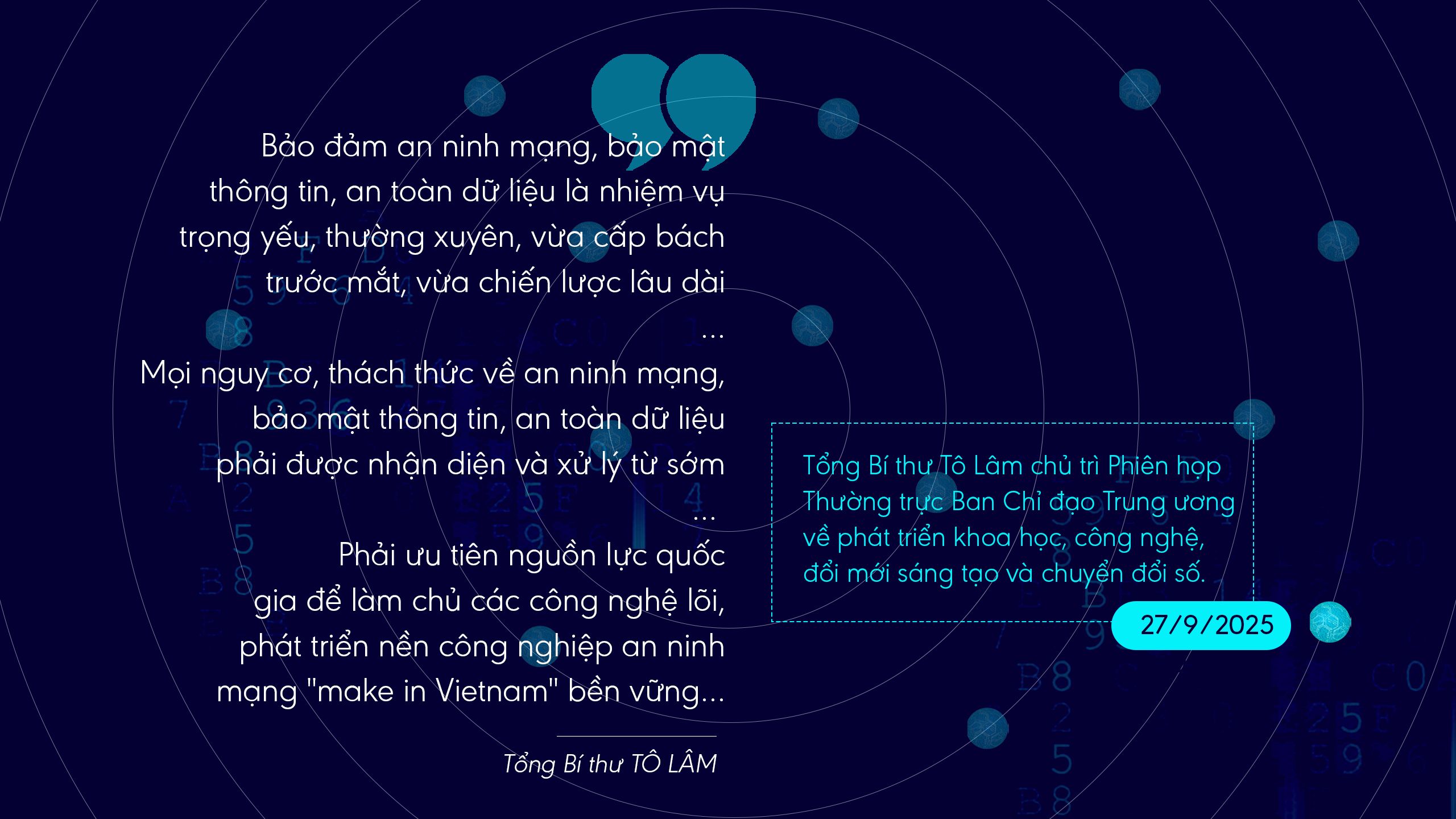 Cùng với việc thúc đẩy xây dựng dữ liệu “đúng, đủ, sạch, sống, thống nhất, dùng chung”, Tổng Bí thư Tô Lâm còn chỉ đạo, nhắc nhở về việc bảo đảm an ninh mạng, bảo mật dữ liệu. Cụ thể, trong thông báo Kết luận của Tổng Bí thư Tô Lâm tại Phiên họp Thường trực Ban Chỉ đạo Trung ương về phát triển khoa học, công nghệ, đổi mới sáng tạo và chuyển đổi số ngày 27/9, đồng chí đã yêu cầu đẩy nhanh tiến độ xây dựng, vận hành hệ thống phòng vệ mạng quốc gia trở thành nền tảng dùng chung trong khung kiến trúc tổng thể quốc gia số.