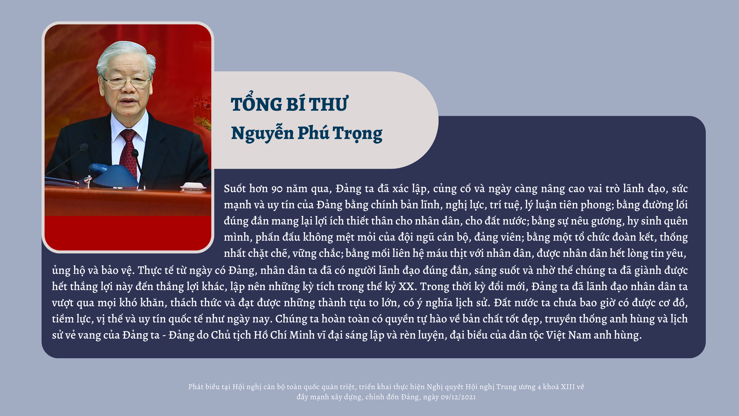 Trước yêu cầu và nhiệm vụ ngày càng khó khăn, nhiều thử thách của sự nghiệp đổi mới, bên cạnh việc xác định phát triển kinh tế là nhiệm vụ trung tâm, Đảng Cộng sản Việt Nam luôn khẳng định, xây dựng Đảng là nhiệm vụ then chốt. Đảng phải thường xuyên tự đổi mới, tự chỉnh đốn, luôn tuân thủ những quan điểm của chủ nghĩa Mác - Lênin và Tư tưởng Hồ Chí Minh về xây dựng Đảng.