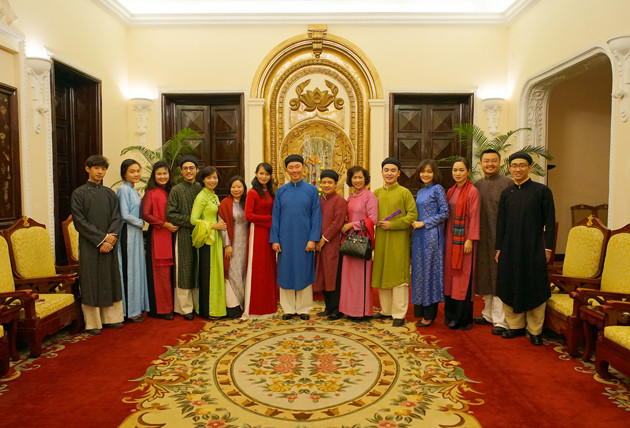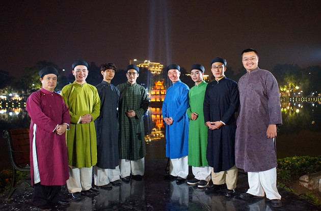 Trang phục áo dài nam của nhóm Đình làng Việt. Ảnh: Gr Đình làng Việt cung cấp.