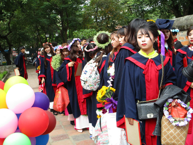 Các nữ sinh viên trong trang phục áo dài và áo choàng cử nhân tại Văn Miếu.