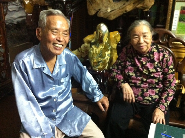 Nghệ nhân Nguyễn Văn Mỹ và vợ bên khối đá Long Phượng kỳ duyên.