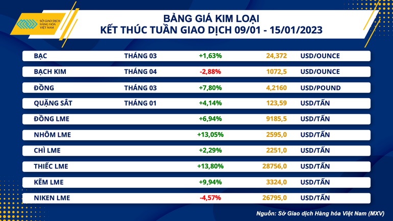 Sắc xanh tiếp tục áp đảo bảng giá kim loại trong tuần vừa qua. Với nhóm kim loại quý, thị trường chứng kiến sự phân hóa nhẹ với giá bạc tăng 1,63% lên 24,37 USD/ounce. Trái lại, giá bạch kim giảm 2,88% về 1072,5 USD/ounce.