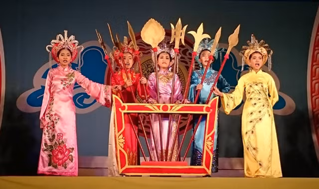 Các học viên "nhí" dự lớp tuồng thuộc dự án "Sân khấu học đường" của Trung tâm Nghiên cứu, Bảo tồn và Phát huy văn hóa dân tộc tổ chức.