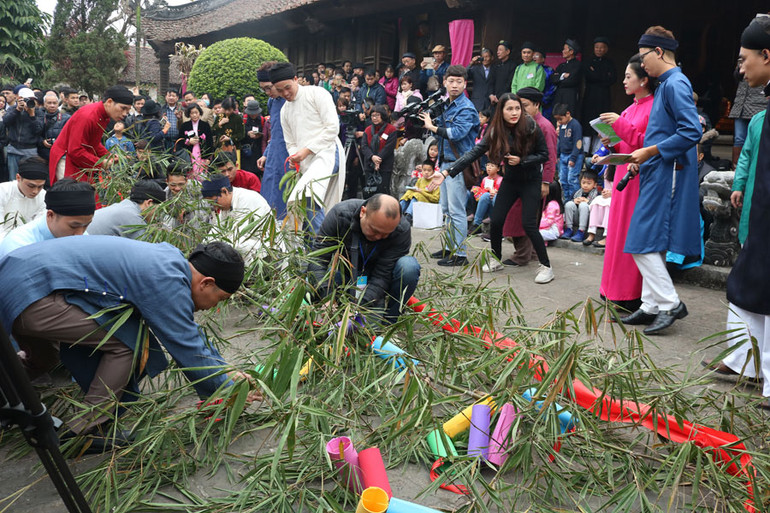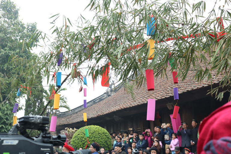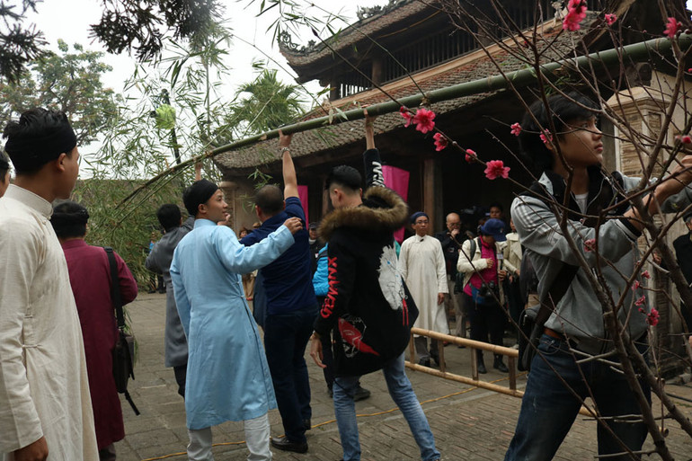 Điểm thú vị của lễ dựng nêu này là ngoài những đồ vật treo trên cây nêu được chuẩn bị đúng như truyền thống, thì rất nhiều bạn trẻ là người làng So hoặc khách tham dự đã dựng nêu trong trang phục áo dài và khăn quấn truyền thống.