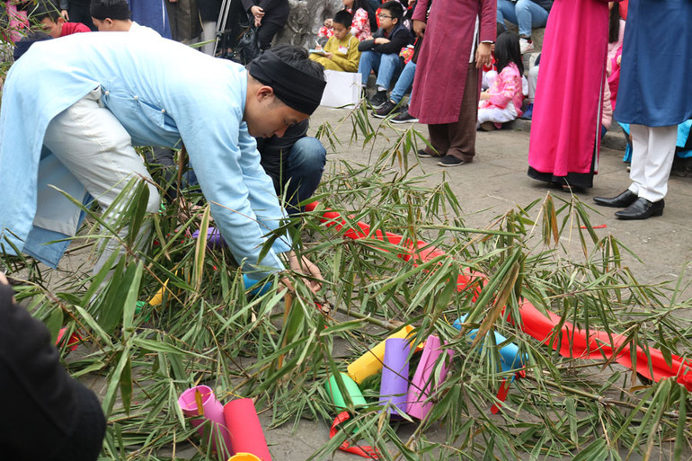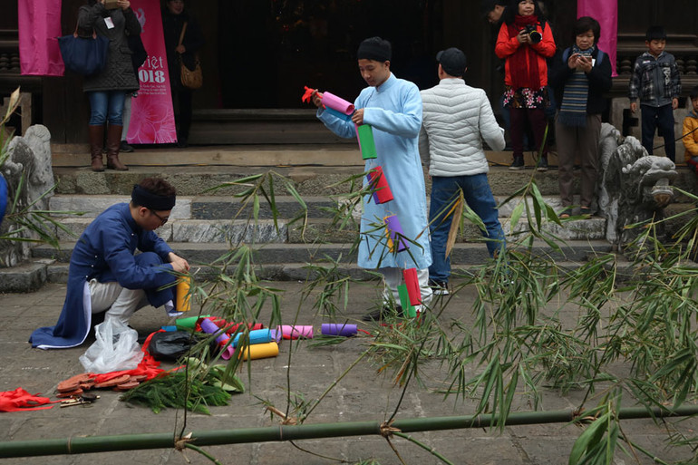 Các bạn nam trong trang phục áo dài truyền thống chuẩn bị dựng nêu.