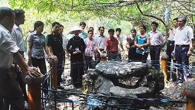 Du khách tham quan bàn đá - nơi Bác ngồi làm việc trong những ngày ở Pác Bó. Nguồn: BÁO CAO BẰNG