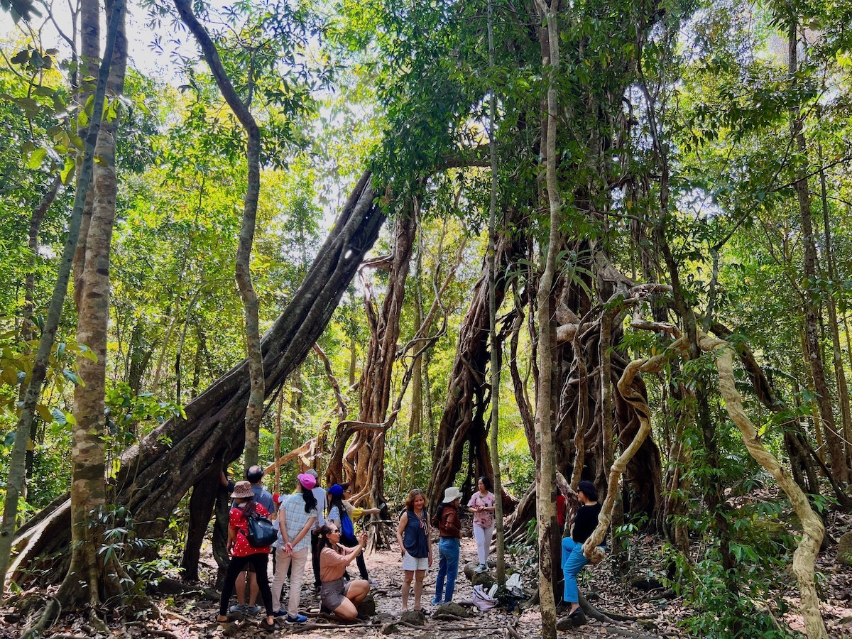 Một nhóm du khách đến từ TP Hồ Chí Minh tham quan cây đa lộc giao với sáu gốc đa lực lưỡng cùng vươn thẳng lên bầu trời, quyện chặt lấy nhau tại ngọn. Vô số rễ phụ ken vào nhau, dây leo ký sinh chằng chịt, tạo nên khung cảnh huyền bí, ma mị. Với vẻ đẹp đó, cây đa lộc giao đã được một số đoàn làm phim chọn làm bối cảnh quay phim.