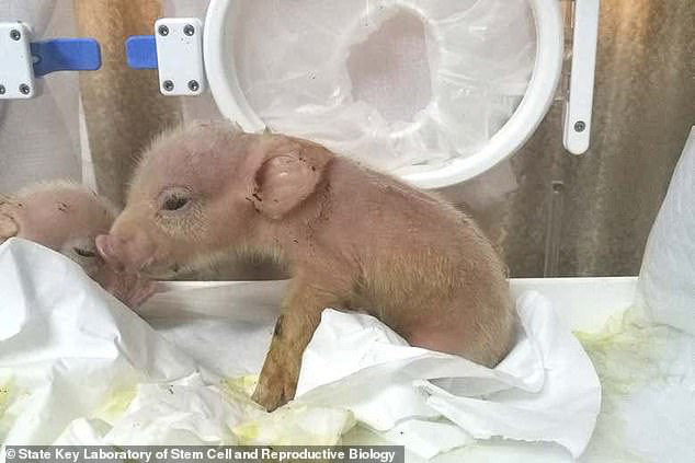 Hai chú lợn lai khỉ được sinh ra trong phòng thí nghiệm ở Bắc Kinh, Trung Quốc. Ảnh: DAILY MAIL.