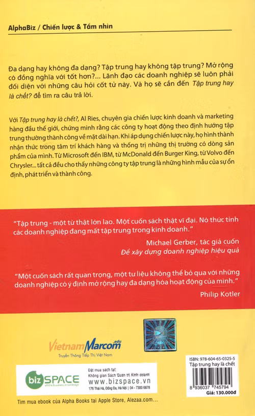 "Tập trung hay là chết" của Al Ries sau gần 30 năm vẫn là một cuốn sách đánh thức tầng lớp doanh nhân về những giá trị cốt tử của sự tập trung đối với sinh tồn của doanh nghiệp.