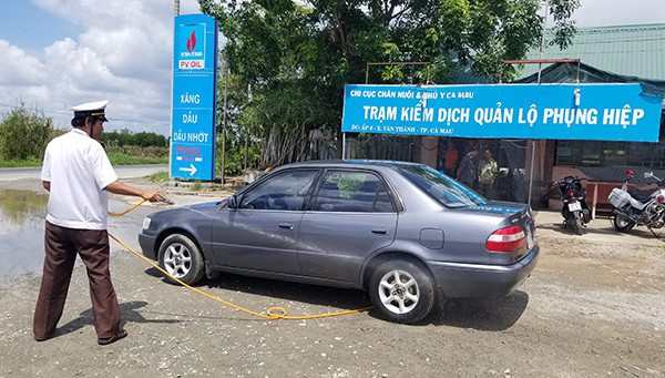 Nhân viên Trạm kiểm dịch Quản lộ Phụng Hiệp tiêu độc, khử trùng xe vào địa bàn tỉnh Cà Mau. (ẢNH: HỮU TÙNG)