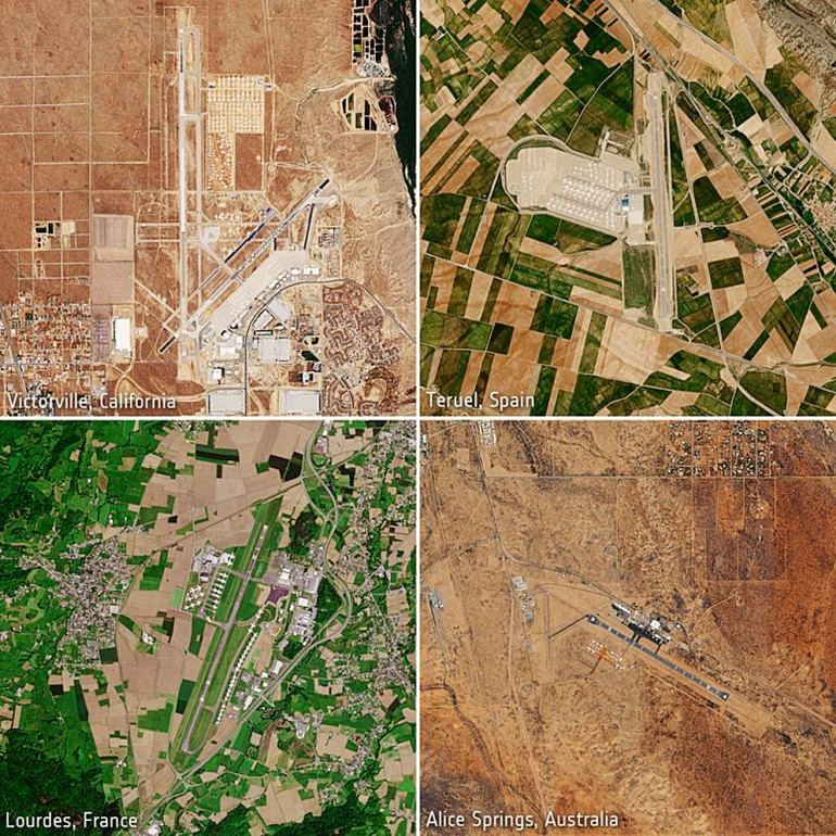 Những hình ảnh này cho thấy các máy bay đậu tại các sân bay khác nhau trên thế giới trong đại dịch Covid-19. Hình ảnh do vệ tinh Copernicus Sentinel-2 chụp vào tháng 5. Nguồn: ESA.