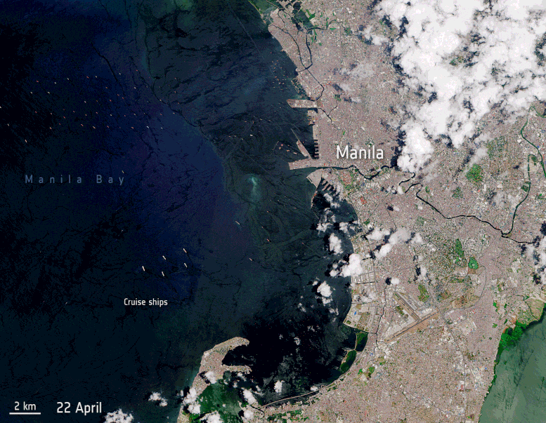 Vịnh Manila, ở Philippines đã được chuyển thành bến đậu cho tàu du lịch. Trong hình ảnh động này, khoảng 20 tàu đang neo đậu ngoài khơi bờ biển vịnh Manila. Bức ảnh do vệ tinh Sentinel-2 chụp, chứa một chuỗi hình ảnh vào các ngày 22-4, 2-5 và 22-5. Nguồn: ESA.