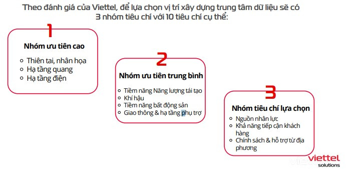 Theo đánh giá của Viettel, để lựa chọn vị trí xây dựng trung tâm dữ liệu sẽ có 3 nhóm tiêu chí với 10 tiêu chí cụ thể: