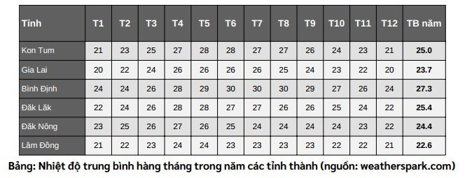 Theo bảng tổng hợp trên, các tỉnh thành như Lâm Đồng, Gia Lai, Đắk Nông, Đắk Lắk có lợi thế nền nhiệt trung bình năm thấp, rất phù hợp để xây dựng data center.