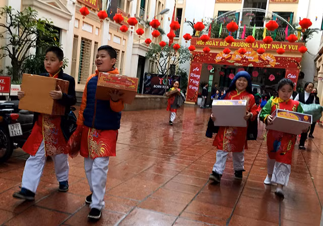 Học sinh Trường tiểu học Trần Quốc Toản (Hoàn Kiếm, Hà Nội) háo hức chuyển quà vào Trung tâm nuôi dưỡng người già và trẻ tàn tật Hà Nội.