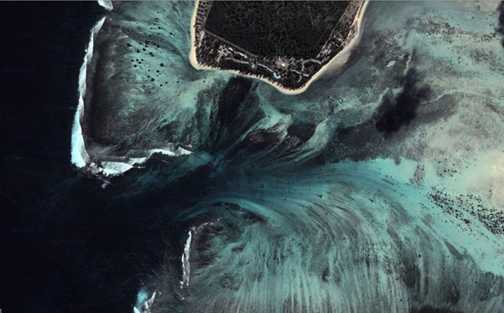 Ảo ảnh thị giác hùng vĩ này, trên thực tế, không chỉ đánh lừa những người tận mắt chứng kiến mà còn xuất hiện rõ nét trên bản đồ vệ tinh. Hình ảnh một vũng xoáy nước khổng lồ ngoài khơi vùng bờ biển thiên đường Mauritius khiến người xem phải sởn gai ốc.