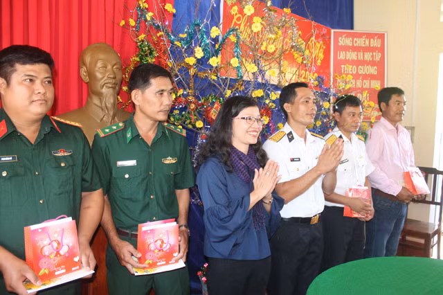 Đồng chí Nguyễn Thị Kim Tuyến, Phó Chủ tịch HĐND tỉnh Đồng Tháp tặng quà Tết cho cán bộ, chiến sĩ và nhân dân trên đảo Hòn Đốc.