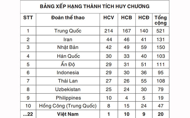 Trong ngày thi đấu cuối cùng, đoàn Việt Nam giành thêm 2 Huy chương bạc (HCB), ba Huy chương đồng (HCĐ), đứng thứ 22 trên bảng xếp hạng. Đoàn Trung Quốc dẫn đầu với 214 Huy chương vàng (HCV), gấp năm lần đoàn Iran xếp thứ hai có 44 HCV. Trong nhóm Đông Nam Á, cùng với Indonesia, Thái Lan xếp thứ 6 và thứ 7, đoàn Philippines đã lọt vào tốp 10 ở vị trí thứ 9 với 10 HCV.