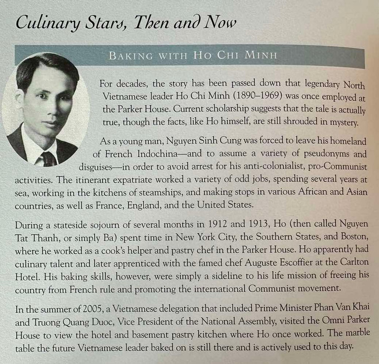 Trong cuốn sách tiêu đề “Thiên đường, theo tiêu chuẩn khách sạn” (Heaven, By Hotel Standards) về lịch sử của khách sạn Omni Parker House, tên Hồ Chí Minh, Nguyễn Sinh Cung, Nguyễn Tất Thành và “anh Ba” được nhắc đến tại nhiều trang và đoạn khác nhau. Dưới mục “Những ngôi sao ẩm thực, ngày ấy và bây giờ” và tiêu đề “Làm bánh cùng Hồ Chí Minh”, tác giả Susan Wilson viết: “Trong khoảng thời gian tạm dừng chân ở Hoa Kỳ năm 1912 và 1913, Hồ Chí Minh (khi đó là Nguyễn Tất Thành hoặc đơn giản là Ba) đã từng đến thành phố New York, một số bang miền Nam và thành phố Boston, nơi Người làm việc trong vai trò phụ bếp và phụ trách lò bánh tại khách sạn Parker House. Hồ Chí Minh đã thể hiện tài năng về ẩm thực và sau đó từng theo học đầu bếp nổi tiếng Auguste Escoffier tại Khách sạn Carlton. Mặc dù vậy, kỹ năng làm bánh của Người không thể sánh được với sự nghiệp giải phóng đất nước khỏi ách đô hộ của thực dân Pháp và thúc đẩy phong trào quốc tế Cộng sản”.