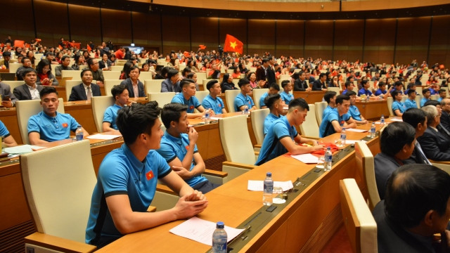 Đội tuyển U23 Việt Nam tại Phòng họp Diên Hồng, Nhà Quốc hội.