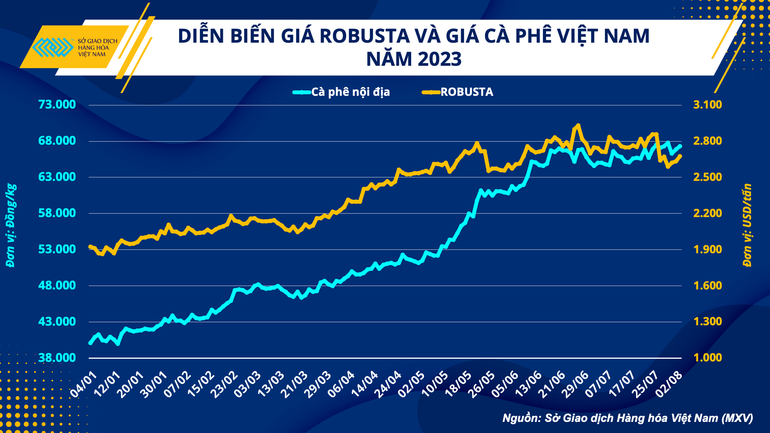 Theo Sở Giao dịch Hàng hóa Việt Nam (MXV), giá cà-phê Robusta đang giao dịch trên Sở Giao dịch Liên lục địa Châu Âu (ICE-EU) tính đến hết ngày 2/8/2023 ở mức 2.681 USD/ tấn. Đây là mức giá cao trong 15 năm và đã duy trì kể từ giữa tháng 6.