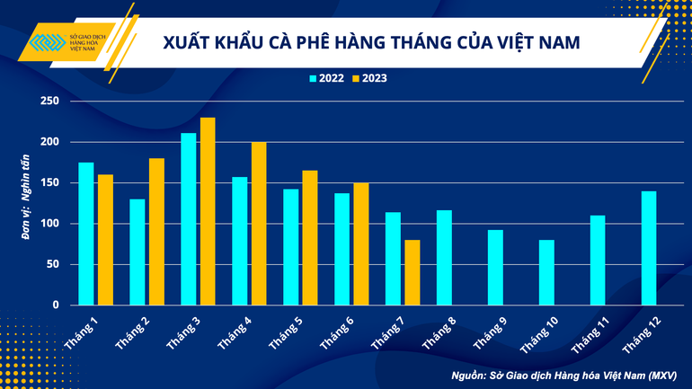 Trong 7 tháng đầu năm 2023, Việt Nam chỉ xuất khẩu 1,09 triệu tấn cà-phê, giảm 6% so với cùng kỳ năm 2022, ước tính từ Tổng cục Thống kê (GSO).