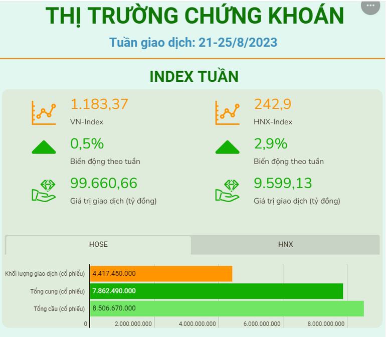 Kết thúc tuần giao dịch 21-25/8, VN-Index phục hồi tăng 0,46% so với tuần trước, ở mức 1.183,37 điểm với thanh khoản suy giảm. HNX-Index phục hồi tốt hơn khi tăng 2,94% so với tuần trước lên mức 242,94 điểm.