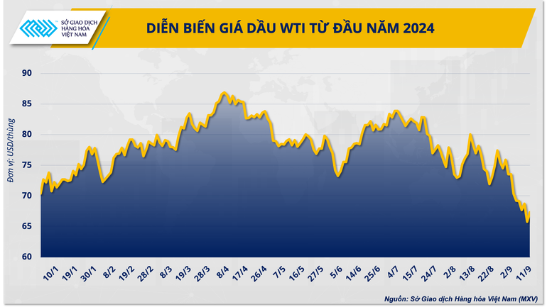 Theo ghi nhận của Sở Giao dịch Hàng hóa Việt Nam (MXV), kết thúc phiên giao dịch ngày 10/9, giá dầu thô WTI giao dịch tại mức 65,75 USD/thùng, trong khi dầu thô Brent giảm xuống dưới 70 USD/thùng lần đầu tiên sau gần 3 năm. Trước đó, tính riêng trong tuần giao dịch đầu tiên của tháng 9, với 5 phiên sụt giảm liên tiếp, giá dầu thế giới đã đánh mất hơn 7% giá trị.