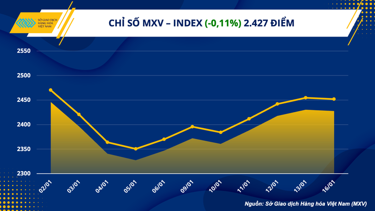 Thông tin từ Sở Giao dịch Hàng hóa Việt Nam (MXV), thị trường hàng hóa tương đối ổn định trong ngày tất cả các mặt hàng nông sản trên Sở Chicago và phần lớn mặt hàng nguyên liệu công nghiệp tạm dừng giao dịch do nghỉ lễ. Chỉ số MXV-Index giảm nhẹ 0,1% xuống 2.427 điểm. Giá trị giao dịch toàn Sở cũng giảm đáng kể, xuống mức 1.200 tỷ đồng.