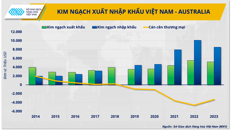 Ngược lại, Việt Nam tiếp tục nhập khẩu từ Australia các sản phẩm như than đá, quặng sắt, bông, lúa mì, kim loại, rau quả... Thị trường bông sợi là một thí dụ điển hình khi Việt Nam trở thành thị trường xuất khẩu bông sợi đơn lẻ lớn nhất của Australia trong năm 2023, chiếm 40% tổng kim ngạch xuất khẩu bông sợi, gấp đôi thị phần năm 2020.