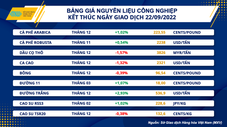 Kết thúc ngày giao dịch 22/9, bảng giá các mặt hàng nhóm nguyên liệu công nghiệp tiếp tục ghi nhận sự phân hóa.