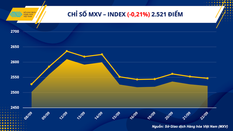 Thông tin từ Sở Giao dịch Hàng hóa Việt Nam (MXV) cho biết, kết thúc ngày giao dịch 22/9, diễn biến giằng co tiếp tục bao trùm toàn thị trường. Đa số các mặt hàng chỉ dao động nhẹ so với ngày trước đó, điều này khiến chỉ số MXV-Index có ngày suy yếu nhẹ thứ 2 liên tiếp, với mức giảm 0,21%, xuống mốc 2.521 điểm.