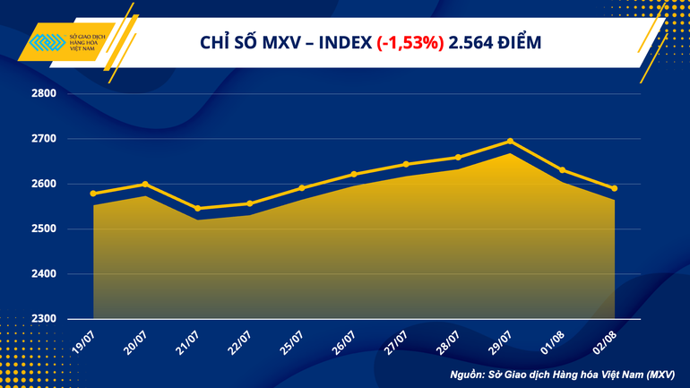 Điều này đã kéo chỉ số hàng hoá MXV-Index giảm 1,53% xuống mức 2.564 điểm. Giá trị giao dịch toàn Sở cũng có sự suy yếu nhẹ, tuy nhiên vẫn đạt mức 4.200 tỷ đồng.