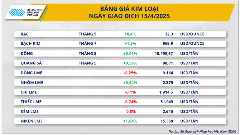 Thị trường kim loại tiếp tục duy trì đà tăng trong phiên giao dịch ngày 15/4 với lực mua áp đảo nhờ kỳ vọng Mỹ sẽ sớm hạ lãi suất và tín hiệu tiêu thụ tích cực từ các ngành công nghiệp chủ chốt.