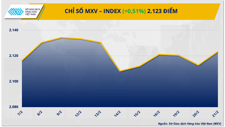 Chốt ngày, chỉ số MXV-Index của 3/4 nhóm mặt hàng trong sắc xanh đẩy chỉ số MXV-Index tăng 0,51% lên 2.123 điểm. Giá trị giao dịch toàn Sở đạt trên 4.100 tỷ đồng.