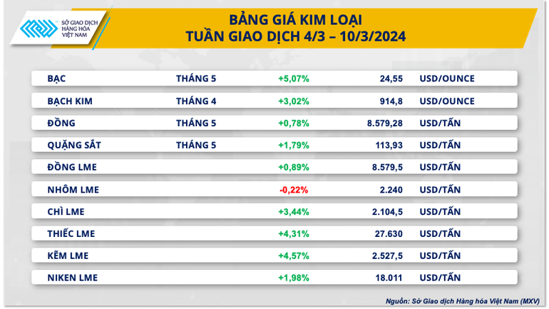 Theo MXV, kết thúc tuần giao dịch ngày 4-10/3, sắc xanh gần phủ kín bảng giá kim loại khi có đến 9 trong tổng số 10 mặt hàng tăng giá. Sự suy yếu của đồng Dollar Mỹ trước kỳ vọng Cục Dự trữ Liên bang Mỹ (FED) cắt giảm lãi suất đã thúc đẩy lực mua mạnh mẽ kim loại. Trong đó, kim loại quý được hưởng lợi nhiều nhất, với bạc ghi nhận mức tăng mạnh 5,07% trong tuần qua lên 24,54 USD/ounce. Giá bạch kim cũng tăng 3,02% lên mức 914,8 USD/ounce.