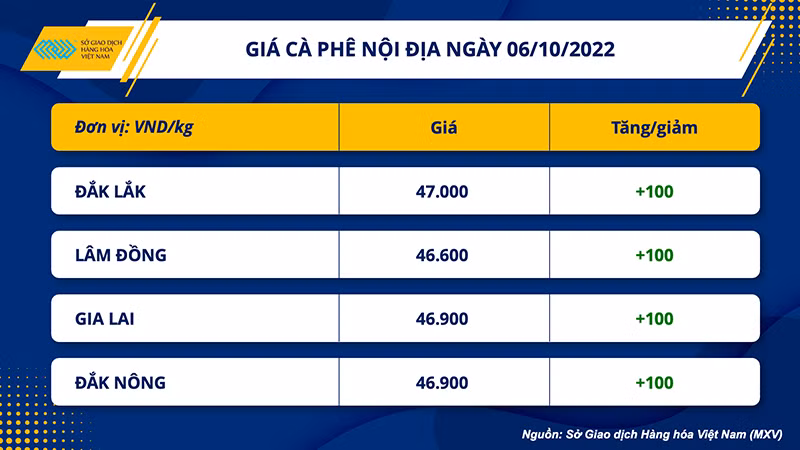 Trên thị trường nội địa, ghi nhận trong sáng nay, giá cà-phê nhân xô tại Tây Nguyên và các tỉnh Nam Bộ đồng loạt tăng nhẹ 100 đồng/kg. Theo đó, giá cà-phê trong nước được thu mua dao động trong khoảng 46.600-47.000 đồng/kg. Như vậy, so với đầu tuần này, giá cà-phê nội địa đã liên tục tăng với mức tổng lên đến 500 đồng/kg.