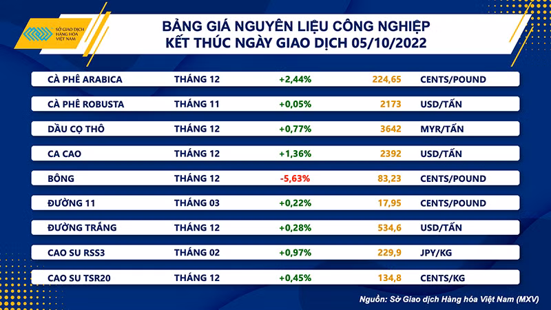 Kết thúc phiên giao dịch ngày 5/10, sắc xanh tiếp tục bao trùm trên bảng giá các mặt hàng nhóm nguyên liệu công nghiệp. Tuy vậy, điểm đáng chú ý nhất lại thuộc về sự sụt giảm gần 6% của bông khi Dollar Index khởi sắc trở lại.