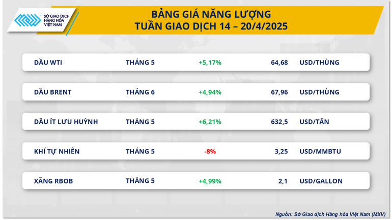 Theo ghi nhận của MXV, thị trường năng lượng tiếp tục gây chú ý khi dẫn dắt đà tăng của toàn thị trường. Giá của 4 trên 5 mặt hàng đồng loạt tăng mạnh từ 4-6% so với tuần trước. Trong đó, hai mặt hàng dầu thô cùng tăng khoảng 5% trong bối cảnh thị trường dần thích ứng với các chính sách thuế quan mới của Mỹ và những lo ngại về nguồn cung từ cuối tháng 3 đã quay trở lại.