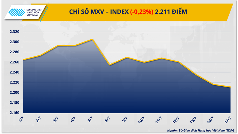Theo Sở Giao dịch hàng hóa Việt Nam (MXV), đóng cửa ngày 17/7, thị trường hàng hóa nguyên liệu thế giới phân hóa rõ nét. Nhiều mặt hàng nhóm nông sản và năng lượng giá tăng tích cực trong khi nhóm kim loại, nguyên liệu công nghiệp lại suy yếu. Lực bán chiếm ưu thế kéo chỉ số MXV-Index rơi tiếp 0,23% xuống 2.211 điểm, nối dài chuỗi giảm sang ngày thứ tư.