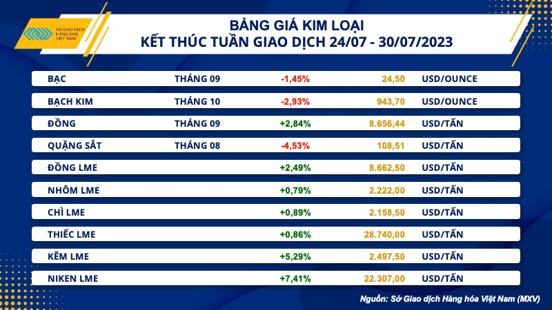 Đối với nhóm kim loại cơ bản, giá đồng COMEX phục hồi sau tuần giảm mạnh trước đó, với mức tăng 2,84% lên 3,92 USD/pound. Trong khi giá quặng sắt lao dốc 4,53% xuống 108,51 USD/tấn, đánh dấu tuần giảm mạnh nhất của giá sắt trong vòng 2 tháng.