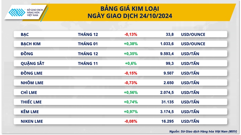 Kết thúc ngày giao dịch hôm qua, thị trường kim loại diễn biến phân hóa, trong đó tất cả các mặt hàng đều ghi nhận mức biến động thấp, thay đổi không quá 0,1% so với mức tham chiếu.