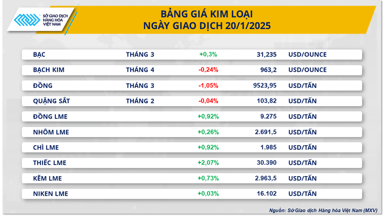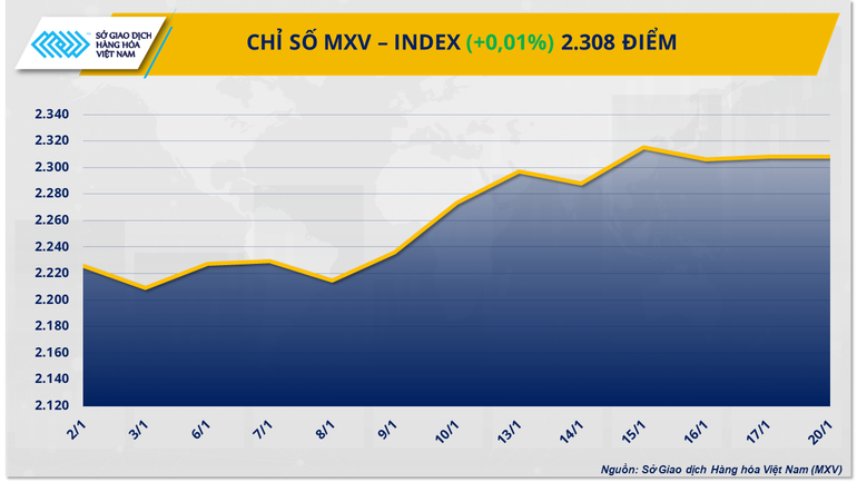 Theo Sở Giao dịch hàng hóa Việt Nam (MXV), thị trường hàng hóa nguyên liệu thế giới khá trầm lắng trong ngày Mỹ nghỉ lễ Martin Luther King, giá một số mặt hàng được tính đến 2 giờ 30 phút sáng nay (theo giờ Việt Nam). Tuy nhiên, lực mua vẫn chiếm ưu thế nên chỉ số MXV-Index nằm ổn định ở mức 2.308 điểm.